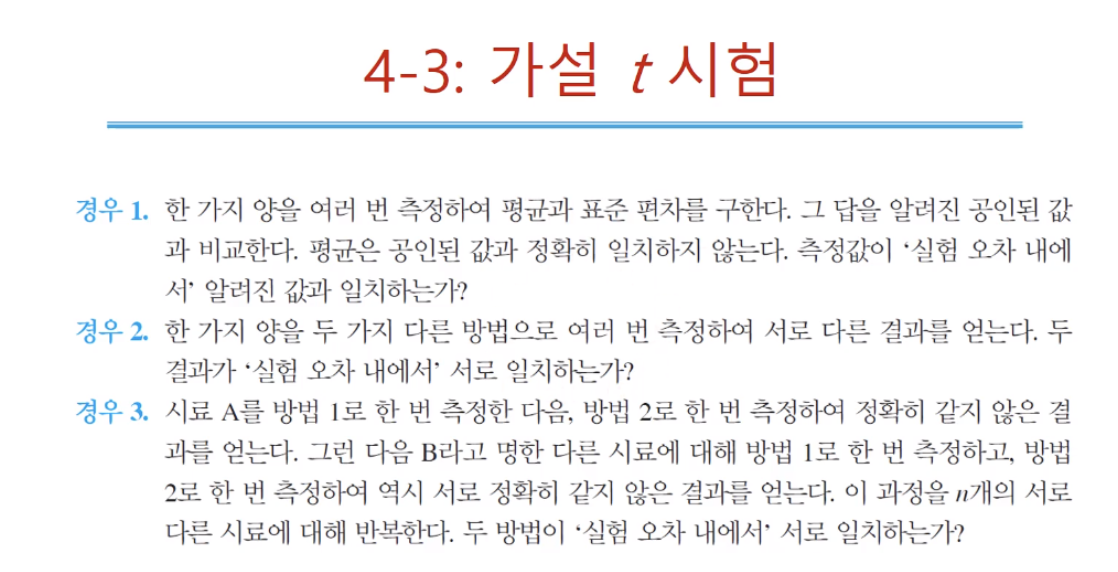영가설은 두 개는 서로 다르지 않다라는 가설인데, 평균값 차이는 조금 있겠지만 그것을 다르지 않다고 말하는 것은 그 차이는 어디에서 기인했는지에 대해 얘기하면서 다르지 않다는 것을 지지한다. 그 차이는 우연오차로 설명 가능해서 그 두 개는 다르지 않다고 해도 무방하다. 그러나 영가설에 위배되는 경우는 반대로 우연오차로 설명될 수 없는 것! 우연오차로 설명 안 되면 계통오차가 들어간 것이다. ex) 위의 표준물질에 제시된 화학식량과 어떤 방법으로 구한 화학식량과 차이 있던 실험에서 우연오차로 설명 안 되면 그것은 계통오차가 기인한 것으로 내 방법에 계통오차가 들어갔다 생각하고 내 방법을 보정해야 한다.