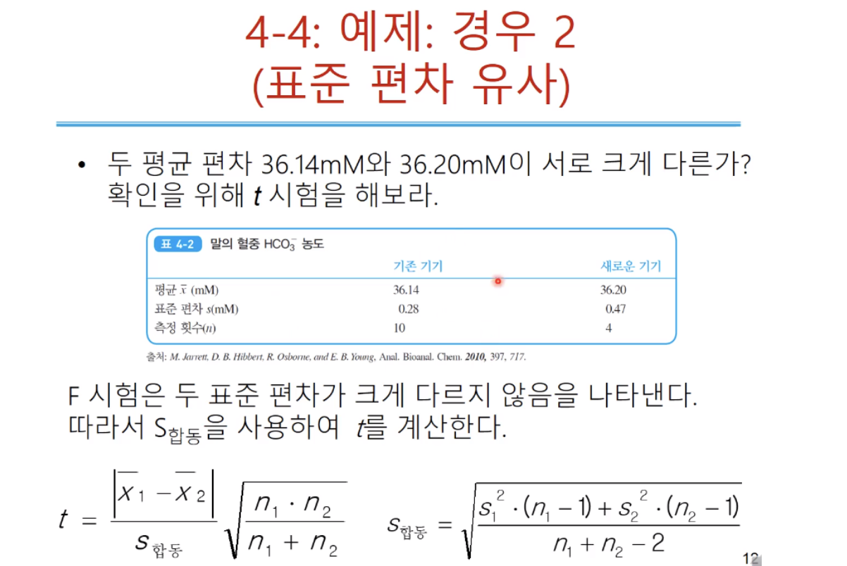 두 개의 기기에서 구한 두 개의 평균을 비교하는 것! 앞에 나온 f - test를 !! 비교! 그러면서 두 개가 서로 다른지 다르지 않는지 결론을 내는 것이다. 두 개의 기기를 썼을 때 다르다라는 결론이 나오면 새로 산 기기가 문제라 수리하고 교체하고, 두 개의 기기가 다르지 않으면 말의 탄산이온 농도를 측정하고 그것을 어떤 말을 검정하는데 활용한다. (f-test는 표준편차에 대한 얘기라 여기서 평균에 대한 얘기로 f-test는 고려하지 않는다.)
