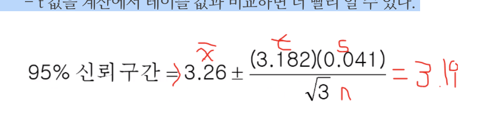 t를 계산할 때 쓰는 방법! 신뢰 구간하는 식을 그대로 쓰고,