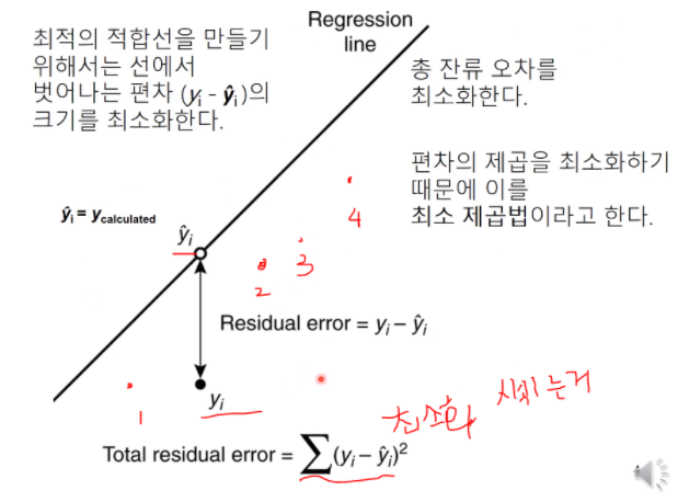 임의의 직선을 구하려고 한다면 데이터 yi가 있을 때 x값이 같은 직선상의 점y^i 차이가 error 가고 할 수 있다. 최소 제곱법의 해당하는 것은 그 차이를 제곱해서 최소화시키는 것이 최소제곱법이다. 근데 이런 포인트가 여러 개 1,2,3,4 등 있을 수 있고 그 차이를 다 합한 total residual error를 최소화시키는 직선을 찾는 과정이다.