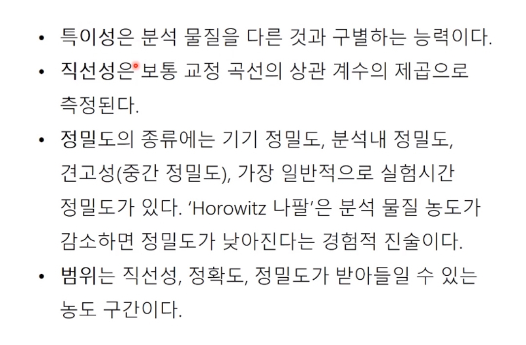 - 범위도 방법 검증을 위해 조사한다. 범위는 정확도, 직선성, 정밀도를 받아들일 수 있는 농도 구간이다!