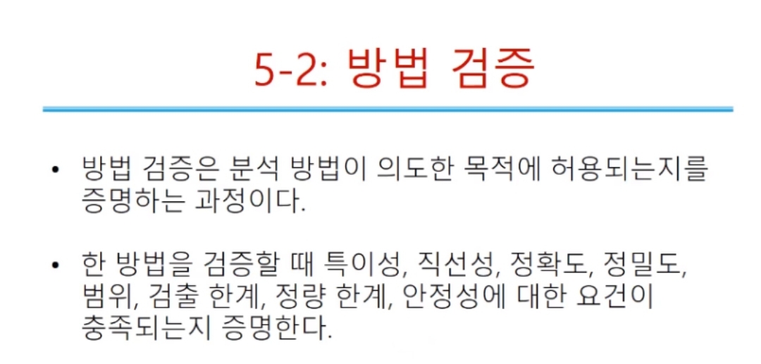 검증할 때 방법에 따라 요소들이 달라질 수 있지만 일반적으로 특이성(선택성), 직선성, 정확도, 정밀도, 범위, 검출 한계, 정량 한계, 안정성 등이 검증 대상이 되는 것이다.