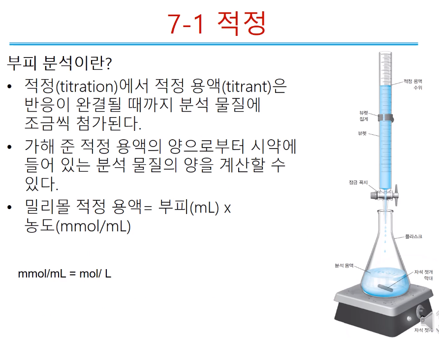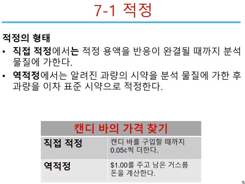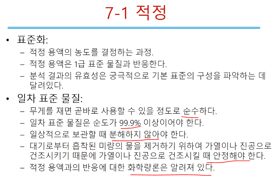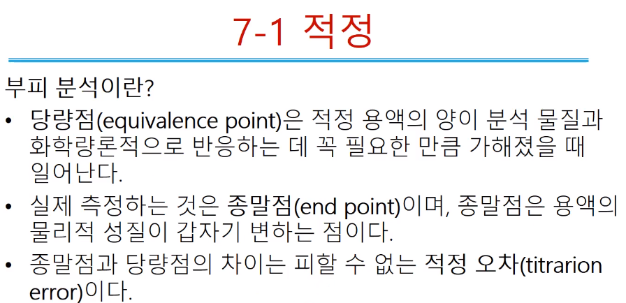 정량 위해 적정 왜 하고, 적정의 기본 원리는 뭐고, 적정을 통해서 어떻게 정량하는지 이해해야 한다.