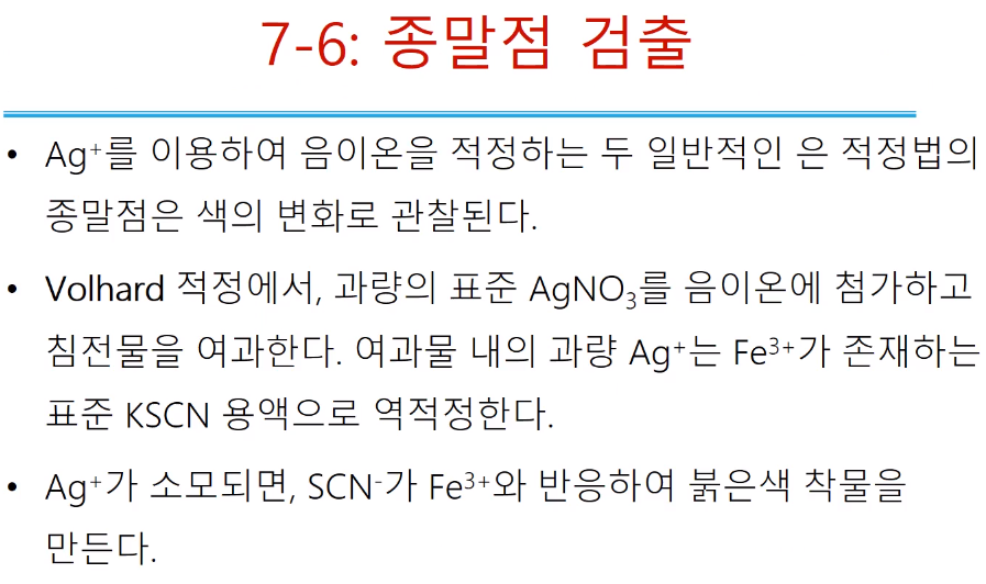volhard법: 역정정을 통해 과량으로 존재하는 Ag+의 양을 정량함으로써 종말점을 찾는다.