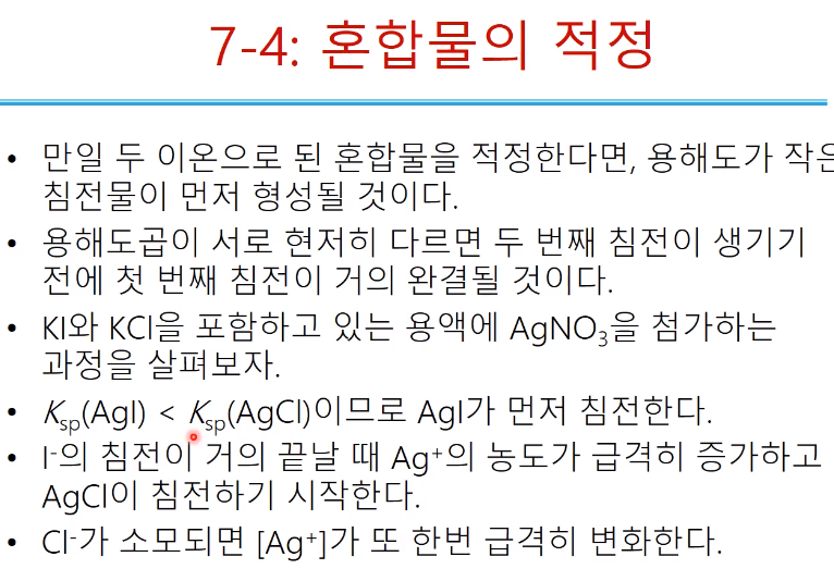 오늘은 혼합물의 적정할 것이다. 앞에서는 요오드 이온 하나만 봤는데 이번은 염소이온까지, 침전할 수 있는 두 가지 이온이 있을 때 은 이온을 이용하여 적정하는 방법을 볼 것이다.