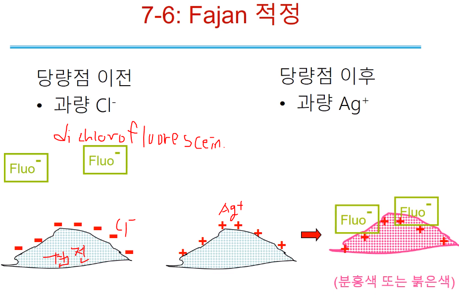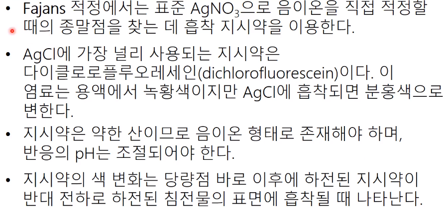 Fajans법: 흡착 지시약을 사용한다. 산-염기 경우 산염기 지시약! 양성자가 붙거나 떨어질 때 지시약의 구조가 바뀌어 흡수하는 빛의 색이 달라져 우리가 보는 보색의 차이로 종말 점을 찾는다. 흡착지시약은 고체 표면에 흡착하면 색이 변한다. 여기서 쓰이는 지시약은 다이클로로플루오레세인(dichlorofluorescein)을 쓴다. 이 미지시약! 염료(dye)는 흡착되면 녹황->분홍색으로 변한다.