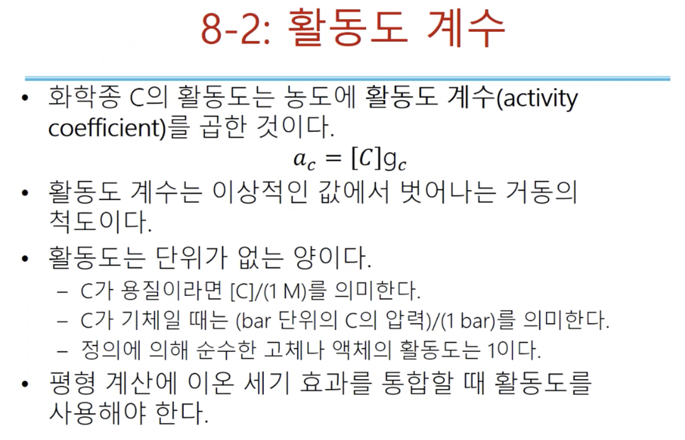 활동도 계수는 농도와 활동도 사이 관계를 말해주는 팩트를 말해준다. coefficient !!