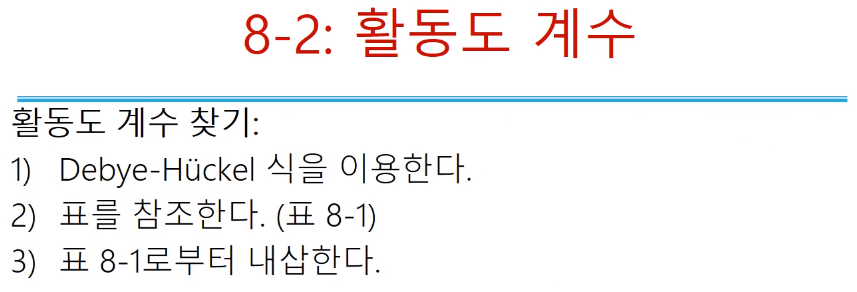 활동도 계수를 어느 정도 알아야 하는 값도 있다. 주로 표를 참고해서 계수를 찾아 적용시킨다. 이온세기가 얼마이고, 어떤 이온인지 아는 경우!!!!
