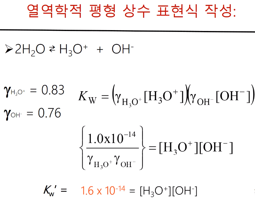 우리가 알고 있던 Kw의 1.0x10-14값은 활동도 일 때 값이었다. 그러나 우리는 농도 값만 갖고 1.0x10-14값을 썼다..