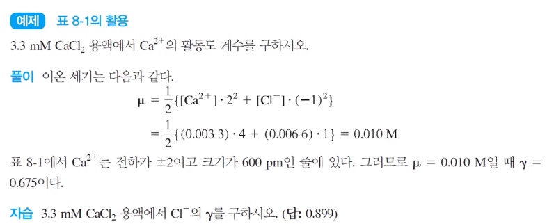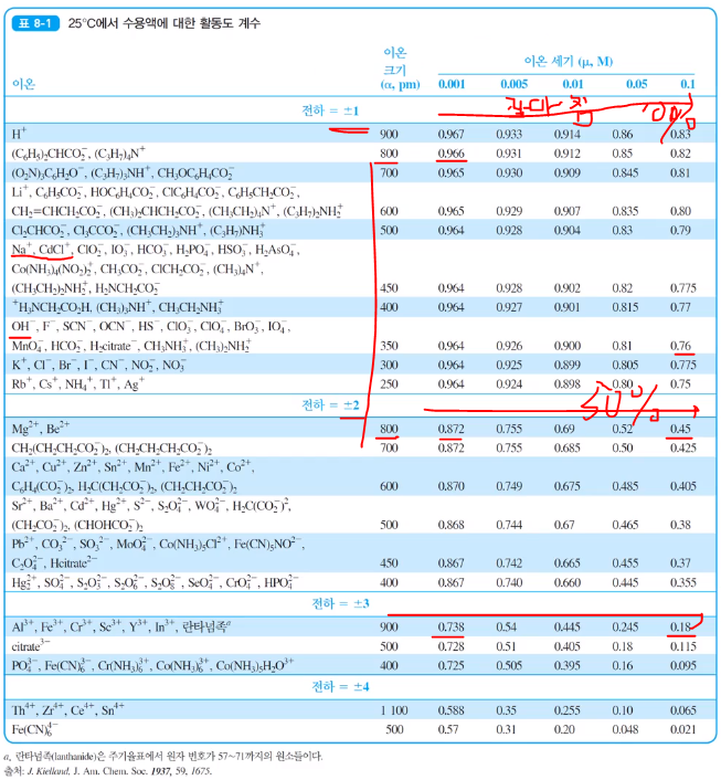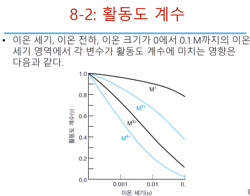 정리! 이온 세기 커질수록, 같은 이온세기일 때 이온 전하가 커질수록 활동도 계수는 더 민감하게 바뀌고, 같은 이온세기일 때 이온 크기가 작을수록 활동도 계수의 감소는 더 커진다.!!! 상당히 중요한 시험에 자주 나온 개념이다.