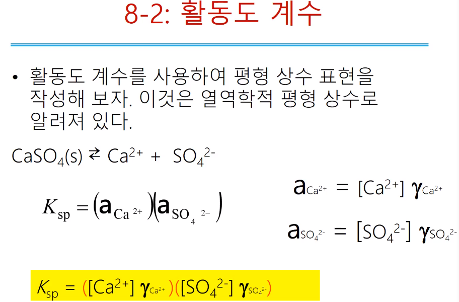 평형상수를 적을 때 6장에서는 평형상수 K= [생성물의 농도] / [반응물의농도] 로 표시했는데, 엄밀히 말하면 평형상수는 농도로 표시하는 게 아니라 활동도로 표시해야 더 정확하다. 위 슬라이드에서 용해 반응에서 평형상수 Ksp= CaSO4(s)는 고체니까 1로 취급하고 각 이온들의 활동도곱하기가 진정한 용해도의 평형상수이다. 앞에서 봤던 평형상수와 차별하기 위해 열역학적 평형 상수로 알려져 있다. 열역학적 이란 말을 자주 생략하고 평형상수라고 하는데 어떻게 구별해야 하냐면 실제 평형상수가 주어지면 활용할 때 활동도가 아니라 쉽게 접근하기 좋게 농도를 사용한다.