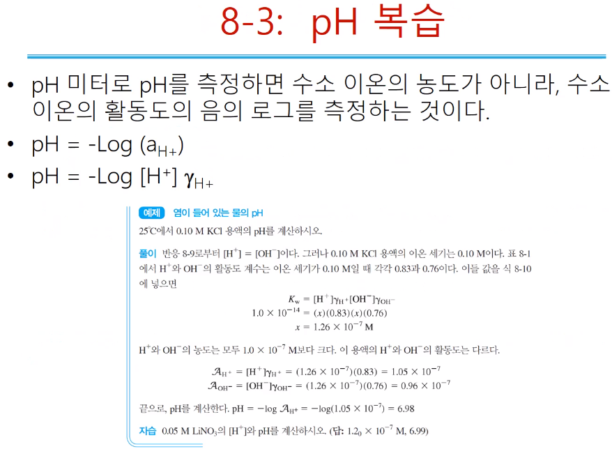 문제 염이 들어있는 물의 pH!!! 염이 있다는 것은 이온세기를 고려해야한다. 적용해야할 평형상수가 25도에서 평형상수이다. 평형상수는 온도만의 함수여서 온도가 달라지면 평형상수가 달라진다. 물이 분해하면 프로톤과 수산화이온이 1:1비율로 생긴다. 0.10 M KCl용액은 0.10M의 K+, Cl-가 생긴다. 수용액 중 프로톤과 수산화이온도 있지만 양이 적어서 0.10 M에 비해서 무시할 수 있다. 전체 이온세기는 0.10M의 K+, Cl-에 의해서만 지배된다. 물에 대한, 수소에 대한 pH에 관계이기 때문 평형상수를 도입해야 한다. Kw=[H+]γH+[OH-]γOH-으로 표시한다. (활동도= 농도 + 활동도 계수 ) Kw는 25도에서 위 식과 같은 값을 갖고, 수소이온을 모르니 x로놓고 활동도 계수는 0.10M에서 테이블로 찾는다. 순수한 물에서 1.00 x 10-7M인데 염을 넣어주니 농도가 더 커졌다. 난용성 염의 구경꾼 이온에 해당하는 이온을 넣어주면 용해도가 증가하는 것과 비슷한 상황이다. 물이 분해되어 평형을 이루는 수소의 농도는1.00 x 10-7M인데 KCl을 넣어주면 물이 분해되는 방향으로 평형이 이동한다. 수소이온과 수산화이온이 더 만들어진 결과 1.26 x 10-7M이 생긴다. pH는 위 슬라이드처럼 구하면 된다. 당연 수소이온의 농도가 커졌기 때문에 7보다 더 낮아졌다. 수산화이온은 농도가 증가했지만 활동도 계수가 보다 작기 때문 1.00 x 10-7M보다는 더 작다. pOH를 구하면 7보다 크다. (활동도 계수가 들어가는 것은 처음에 매우 까다롭다....성질을 이해하고, 테이블 찾고, 계산하고.. 실제로 써먹을 때 필요한 지식들이 있습니다. )