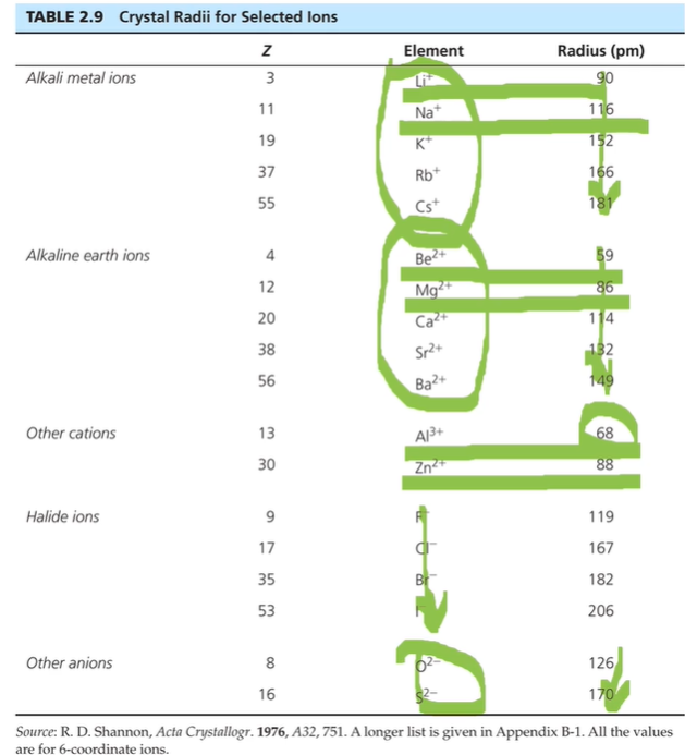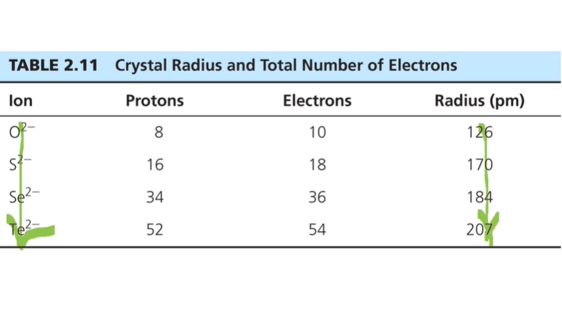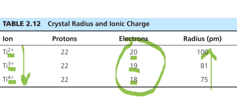 동일한 16족 원소들의 2가 음이온인데 아래로 갈수록 더 큰 전자껍질의 전자가 채워지며 크기가 증가하는 것을 알 수 있다. 같은 타이타늄 이온의 차지가 달라짐에 따라서 원자 이온반지름이 어떻게 달라지는지 모여주는 표이다.