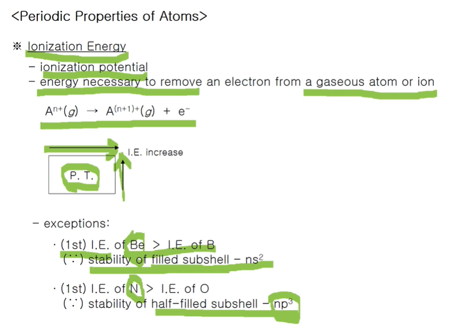 같은 주기에서 오른쪽으로 갈수록 유효 핵전하가 증가하고 핵과 전자 사이에 인력은 강해지고 떼어낼 때 필요한 에너지가 증가됨. 같은 족에서는 위로 갈수록 원자 반지름이 작아지므로 최외각 전자껍질의 전자가 원자핵에 더 가깝게 되고 핵과 전자 사이 인력이 더 강해지고 에너지도 비례한다. 예외는 있다! 이온화 에너지는 1, 2, 3... 차 에너지라 한다. 차수가 없으면 대게 1차라고 보면 된다. 베릴륨과 보론의 이온화에너지를 비교했을 때 보론이 더 오른 쪽에 있으니 보론의 이온화에너지가 더 커야 하는데 베릴륨이 더 크다.