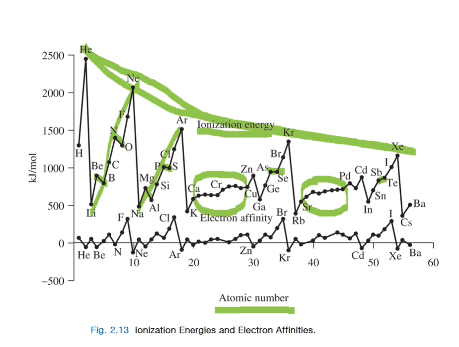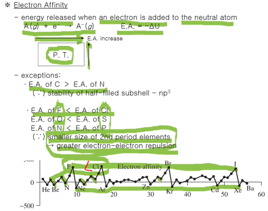 예외가 있는데 탄소와 질소 전자친화도를 비교해보면 주기율표상 경향성으로는 질소가 더 커야 하는데 반대로 탄소가 더 크다. 이것은 많이 채워지거나 반만 채워진 부껍질의 안정성 때문이다. 탄소는 2s. 2p2로 하나가 채워지면 하프로 되고, 질소는 하프인데 전자 하나가 채워지면 깨지니까 이러한 이유 때문이다. 이온화에너지에서 나타나지 않은 경우로 FON이 ClSP 보다 더 작다는 것! 그 이유는 FON의 크기가 작으므로 작은 반지름의 궤도함수에 많은 수의 전자가 분포하게 되면 이들 사이의 전자, 전자 간의 반발이 더 커지게 되므로 이러한 현상이 나타난다.( 이미 꽉 차 있는 상태에 전자가 추가되니 반발력이 커진다. 3주기 이후가 되면 반지름이 커서 반발력 영향이 적다.) 비활성기체는 거의 다 바닥인데 비활성기체는 안정한 전자배치를 갖고 있는데 전자 하나 더해지면 불안정해지기 때문....