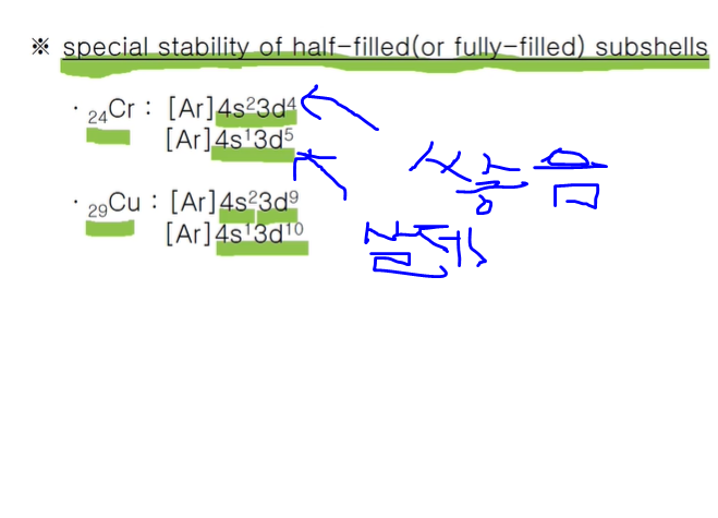 전자배치 중 쌓음 원리에 규칙적으로 전자배치가 채워지는 게 아니라 불규칙도 있었.