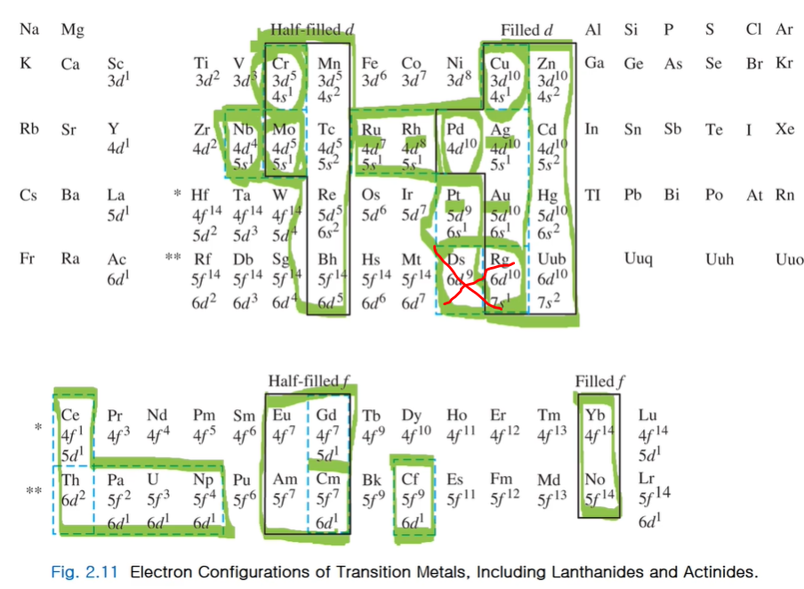 파란색 점선은 예외적으로 쌓음 원리와 달리 전자배치가 나타납니다.