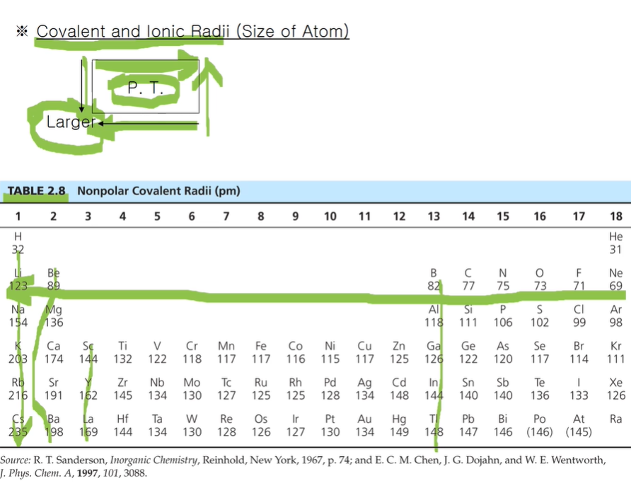 원자의 크기는 원자의 반지름으로서 원자가 다른 원자와 결합을 할 때 어디까지 원자가 공간을 차지하느냐에 대해 원자의 크기를 얘기한다. 공유, 이온 결합할 때 반지름으로 원자의 크기를 얘기한다. 그래서 공유 반지름, 이온반지름으로 얘기를 한다. 주기율표상에서는 왼쪽 아래로 갈수록 원자의 크기는 커집니다. 오른쪽으로 갈수록 유효 핵전하가 증가한다 즉, 전자를 더 강하게 잡아당겨서 결속시킨다는 것으로 크기가 작아진다는 것! 위로 갈수록 원자 반지름이 작아지는데 주양자 수가 작은 전자껍질(n 값)이 채워지기 때문에 크기가 작다. 수소는 32옹스트롱, 탄소는 77A