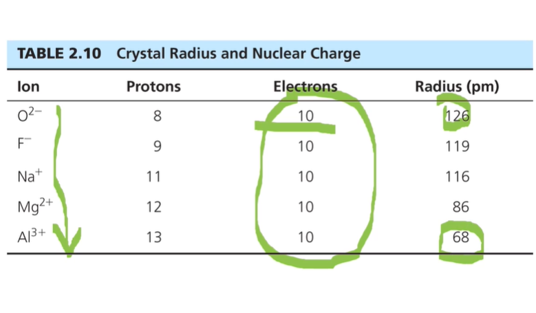 따라서 차지가 증가하면 유효 핵전하가 증가하고 전자가 핵에 더 강하게 붙들려서 더 수축되고 이온반지름이 줄어든다. 전자의 개수가 줄어드는 것만으로도, 전자가 분포하는 부피가 줄어들어 크기가 줄어들기도 하며 핵을 가려주는 전자도 줄어들어서 전자와 핵 사이 인력이 더 강해져 수축이 더 되고 반지름도 더 많이 감소한다.