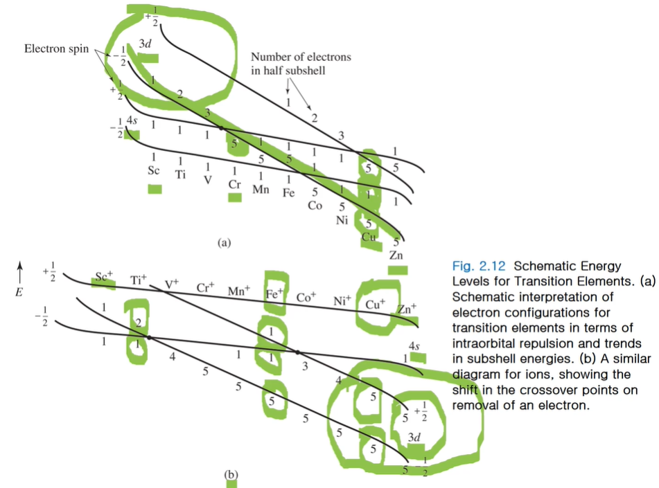 이런 경우 각 원자에 있어서 전자가 어떻게 채워지냐면 Cr 경우 아래 4s의 -1/2에 전자 1개 먼저 채워지고 그다음 높은 곳 3d의 5개 전자가 채워진다. 구리의 경우에도 3d에 스핀업(업스핀) 5개 채워지고 4s에 스핀업 1개 채워지고 3d 스핀 다운으로 5개 채워졌다. 구리 +일 경우 3d 먼저 5개씩(업, 다운 총 10개) 채워지고 Fe+경우 3d 5개 4s 1개 3d 1개로 3d6 4s1로 채워진다. 타이타늄 경우 중성원자라 하면 s2개 d에 2개! 양성자면 4s, 3d에 2개의 전자배치를 갖는다. 이러한 그래프를 이용하면 중성원자와 1가 양이온, 2가 양이온의 전자배치를 비교할 수 있다. 이런 그래프를 보지 않더라도 4s 오비탈의 전자가 먼저 떨어져 나가는 것을 알고 있자!