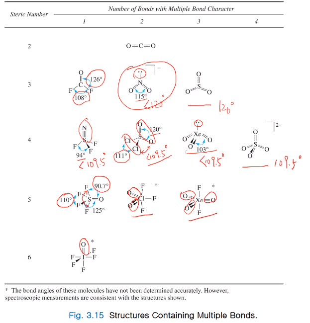 - XeO3 이경우 103도로 109.5도 보다 작은 것은 이중결합이 론페어보다 적은 공간을 차지하기 때문이다.