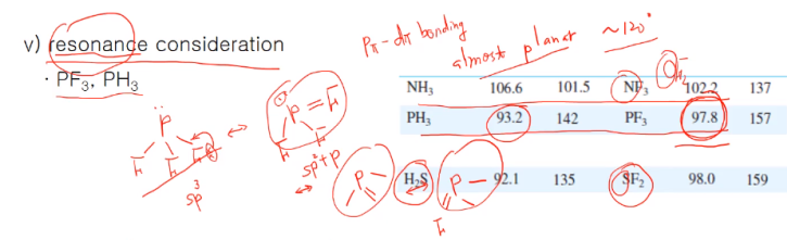 이 결합이 F의 p 오비탈과 P의 비어있는 d 오비탈 사이에서 이루어지는 pπ-dπ bond !!! p주위의 원래 자기가 갖고 있던 전자들은 sp2 + p 혼성화를 하고 비결합 전자쌍은 p 오비탈에 들어가면서 이 공명구조는 거의 삼각평면에 가깝기 때문에 PF결합이 거의 120도에 가까운 공명 구조다. 물론 공명 구조의 기여도는 가장 안정한 단일결합 루이스 구조에 비해서 적지만, 결합각이 120도로 가까운 공명 구조가 존재하고 공명 구조의 영향에 의해 PF결합각이 치환기의 전기음성도만 고려했던 거와 달리 PH3보다도 결합각이 더 큰 값이 얻어진다. SF2도 3주기로 확장된 껍질을 쓸 수 있으니 같은 이유로 예외 해당된다. O의 경우에는 2주기 원소로 확장된 껍질이 없으므로 공명 구조가 없다.
