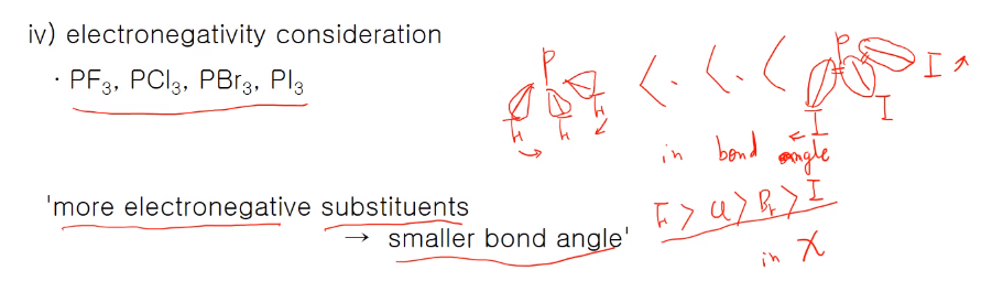 → 치환기 경우 전기음성도가 커질수록 결합각이 작아집니다.