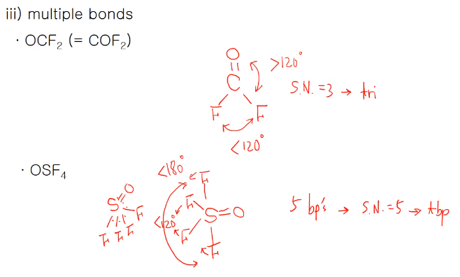 - OSF4 경우 이중결합의 O에 의해 axial OF는 90도 보다 크고 equatorial에 있는 OF는 120보다 크다. 경우에 따라 멀티플 본드와 론페어가 같이 들어 있는 경우 론페어가 더 많은 공간을 차지하고 더 큰 반발한다.