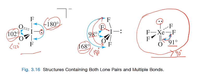 론페어와 본딩페어가 올 때 일반적으로 론페어가 더 공간을 많이 차지하고 반발을 크게 하니까 론페어주위 결합각이 더 크다. 이중 이중 결합보다 이중 단일결합이 반발이 더 적어 결합각이 낮고 axial 결합각에도 영향을 준다. 그러나 론페어가 무조건 공간을 많이 차지해서 다른 결합각에 영향을 주지 않다 옥타히드럴 구조를 보면 알 수 있다. 론페어가 멀티플본딩페어보다 더 많은 공간을 차지한다고 봤는데 91도를 보면 설명이 되지 않는다.