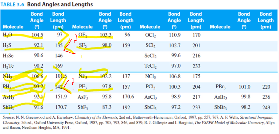 위의 내용 토대로 전기음성도만 고려하면 H2S와 SF2를 비교하면 SF2가 더 작아야 하는데 예외적이다. 또 PH3, PF3도 예외적인 모습을 볼 수 있다. 치환기, 중심 원자의 전기음성도만으로 설명 불가능한 경우 또 다른 기준이 있다.