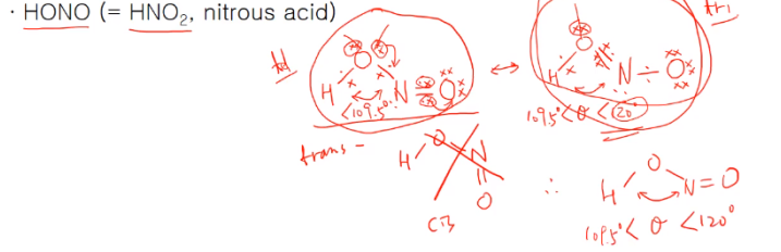 위 그림과 같이 trans, cis HNO2 경우가 있는데 trans경우 O에 있는 비공유 전자쌍이 N 과의 결합으로, ON의 이중결합 중 전자가 산소로 빠져나가면 이중결합이 한칸 옮겨진다. 일반적으로 가장 기여도가 큰 공명구조이며 첫 번째 경우 경우에 O 주위에 비공유 전자쌍이 두 개니까 HN이 109.5보다 작을 것이고,