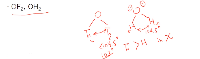 전기 음성도가 클수록 전자를 더 당겨 중심 원자에 부족하게 하니 결합각이 더 작아진다. H2O는 104.5, OF2는 103도이다.