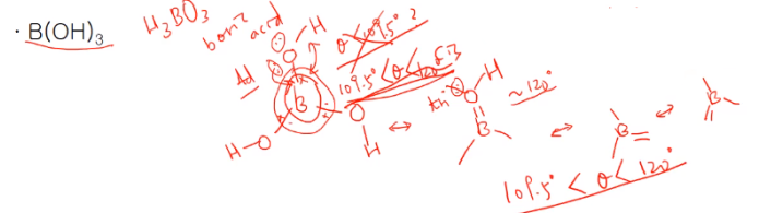 OH가 여러 개 있는 염기성 물질으로도 보는데 다시 풀어쓰면 H3BO3 인 붕산(boric acid)이다. 중심원자 B 주위의 3개의 O가 삼각형 구조로 있고, O 주위의 H가 결합되어 있다. BH 결합각이 단순히 알코올이나, 물의 경우에서는 109.5도 보다 작아야 하지 않을까? 아니다. 실제로는 109.5도 보다 크고 120도보다 작은 결합각을 갖는다.