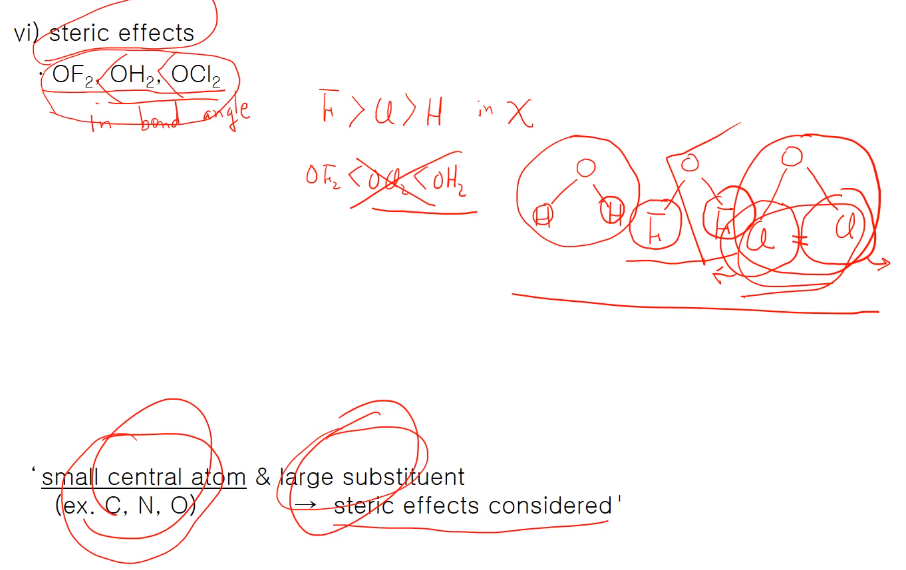 중심원자O인 2주기원소는 공명구조도 고려되지 않으며 치환기 전기음성도만 갖고 판단해야 하는데 전기음성도는 F>Cl>H in χ, 전기음성도로 결합각 순으로 보면 OF2 < OCl2 < OH2 로 됩니다. 그러나 실제 크기는 OF2 < OH2 < OCl2 로 바뀝니다. 왜? 입체효과 때문이다. 상대적으로 크기가 작은 O 원자이고 F정도 까지는 큰 원자가 아니라 입체효과가 거의 무시할 정도로 작은데,
