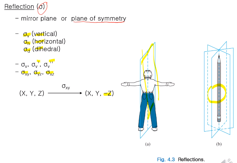 Sigma v, h, d로 구분할 수 있다. 그룹 이론 얘기할 때 서로 다른 미러플래인에 대한 대칭 조작이 나오고 경우에 따라 여러 개의 Sigma v 가 있을 수 있는데 σ', σ'' 프라임을 통해 표기한다. xyz 축상에 나타나는 미러플래인은 xy평면이 미러플래인이면 σxy로 표기한다. 어떤 xyz 좌표에서 σxy미러플래인을 적용하면 xy의 좌표값은 변함이 없지만 z는 -로 부호가 바뀐다. 이런 리플랙션을 할 수 있는 미러플래인을 갖는 물체는 a), b)처럼 있다. 모든 사람이 대칭을 잘 갖는 건 아니지만 대략적으로~ 저런 대칭성이 있다. 옷도 양쪽 똑같은 주머니와 !!! 이런 점들은 가정.... ㅎㅎ 연필은 세 개의 거울면이 위와 같이 여러 개가 나올 수 있다.