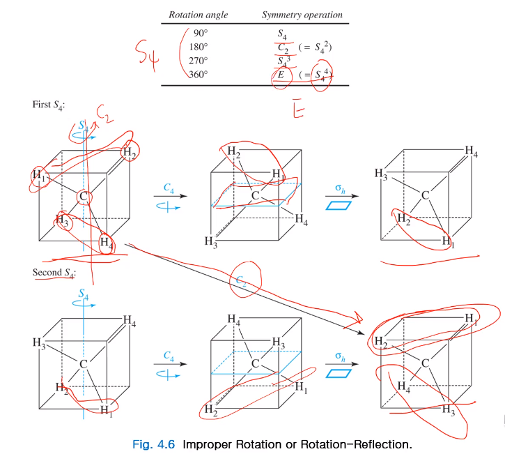 S4 회전 반사 축을 갖는 메테인 분자에 있어서 S4 대칭 조작이 어떻게 일어나는 보여준다. 메테인 분자는 사면체 기하구조로 정 육면체의 대각선으로 마주 보는 꼭짓점 두 개와 아래쪽에 마주 보는 다른 대각선 꼭짓점 두 개로 사면체 기하구조이다. 탄소는 정 육면체 중심에 있다. 마주 보는 두 사면체를 관통하는 축이 C2회전축이면서 동시에S4 회전축이다. S4를 수행하면 H1,2 기준으로 봤을 때 90도 C4를 돌리면 두 번째 그림이 될 것이다. 여기에 C4축에 직교하는 σh 플래인을 반사시키면 H1,2가 밑으로 세 번째 그림이 될 것이고, 첫 번째, 세 번째 그림과 같아진다. 두 번째 S4를 해서 다시 90도 바뀌면 다섯 번째 되고 σh 플래인을 반사시키면 여섯 번째 될 것이다. 그랬을 때 또한 여섯 번째, 첫 번째 같은 모양으로 S42로써 같은 모양 반복되고 S42는 첫 번째에서 여섯 번째로 바로 가면 C2가 된다. 즉, 180도 돌리면 H1, H2가 자리 바꾸는 것이다. S4는 고유한 대칭 조작이 되는데 S42는 C2가 되는 것이다. S43도 고유한 회전 반사 대칭 조작이 되지만, S44는 360도 돌려서 자기 원래 모양 돌아오는 동등 조작 E로 된다.