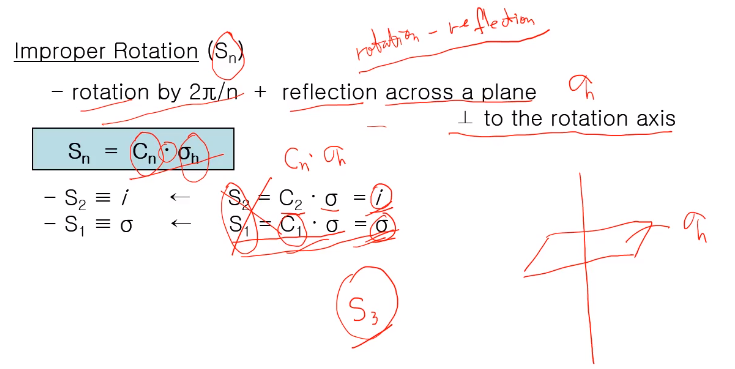 기호로 표기하면 "Sn =Cn ·σh " Cn 과σh 가 연속적으로 수행하다고 표현할 때 ·(dot)을 표기한다. S1=C1 ·σ 여기서 C1은 사실 360도 완전히 도는 것으로 아무것도 안 하는 것과 같다. 그래서 S1은 Sigma다. S2=C2 ·σ인데 C2에 직교하는 sigma를 하면 inversion high가 된다. S1, S2는 자기의 고유한 대칭 조작이 있는 게 아니라 Sigma(미러플래인 반사)와 i(반전 중심)이지 자기의 고유한 회전 반사가 아니다. 회전 반사 대칭 조작은 S3부터 자기의 고유한 대칭 조작이 됩니다.