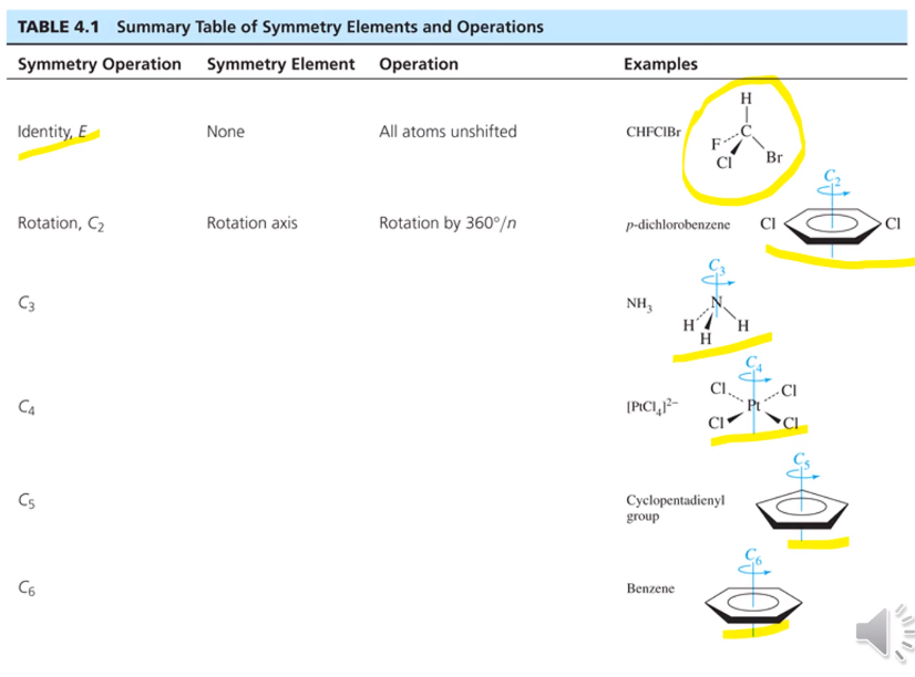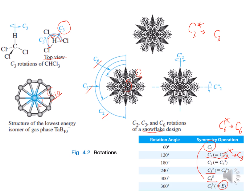 어떤 대칭요소 미러플레인이 있을 때 그에 따라 생기는 대칭 조작은 하나 반전중심 !있다. 등등 이렇게 얘기할 수 있다. 회전축이 하나 있을 때 여러 대칭요소가 있을 수 있다. C4회전축은 90도 돌릴 때마다 같은 모양이 반복되면서 360 한 바퀴 돌면 같은 모습이 4번 반복됩니다. 처음 90도 돌릴 때 대칭 조작과, 한 번 더 돌리면 180, 한 번 더 270,완전히 돌려 360도 될 때 이 대칭 조작이 다 다른 대칭 조작이 됩니다. C4-1,2,3,4가 나타난다. 즉 C4에는 4개가 가능하다.C4의 경우에는 원래 자기 모양으로 돌아오기 때문 C4의 고유한 대칭 조작이라 하기 어렵다.