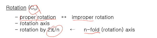 회전은 반사 회전(improper rotation)과 일반 회전(proper rotation,Cn)이 있다. 회전은 대칭요소가 회전축이고 회전축을 기준으로 Cn이라고 했을 때 2π/n이라하고 만약 C4면 2π/4면 즉, 90도 마다 같은 모양이 반복된다. Cn회전축을 n-겹 회전축 (n-fold axis)라고 한다.
