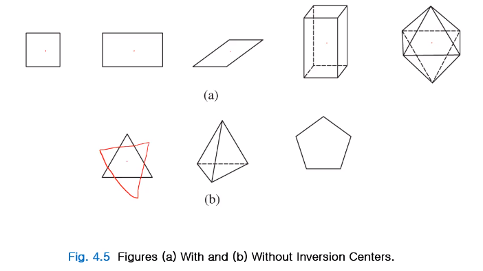 inversion center가 있는 모양과 없는 모양이다. (a)는 다 있고, 정사각형 중심, 직사각형 중심, 사다리꼴 중심, 직육면체 중심, 팔면체 중심 등이 반전 중심이 되지만 (b)의 삼각형, 사면체, 오각형의 경우 반전 중심을 시행하면 모양이 뒤집어져서 같은 모양이 아닌, 반전 중심이 없는 형태다!