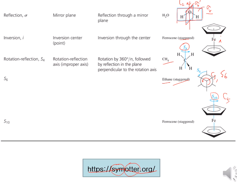 로테이션과 리플랙션이 연속해서 일어나서 로테이션 - 리플렉션이라고(회전(회영) 반사) 한다. 회전 반사는 (Cn ·σh) Cn에서 나타나는 2pie/ n으로 회전시키고 회전축에 수직인 면으로 sigma h로 반사시키는 형태이다. 관례상 정의상 회전축은 z축 수직으로 세우고, 직교하는 면은 수평으로 horizontal 수평 미러 플래인(sigma h)이다.