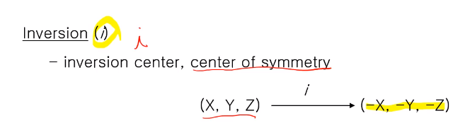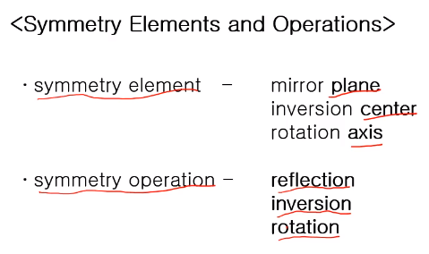 - 대칭 요소(symmetry element): 어떤 면, 점, 축이 됩니다.