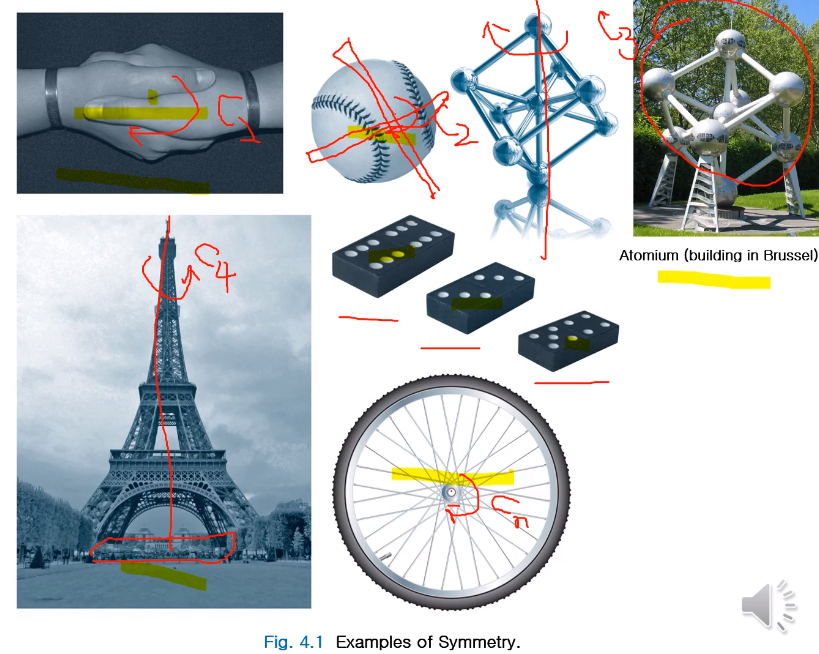 맞잡은 손, 야구공, 이어 붙인 주사위들, 자전거 휠, 에펠탑 등등에서 대칭성을 관찰할 수 있습니다.