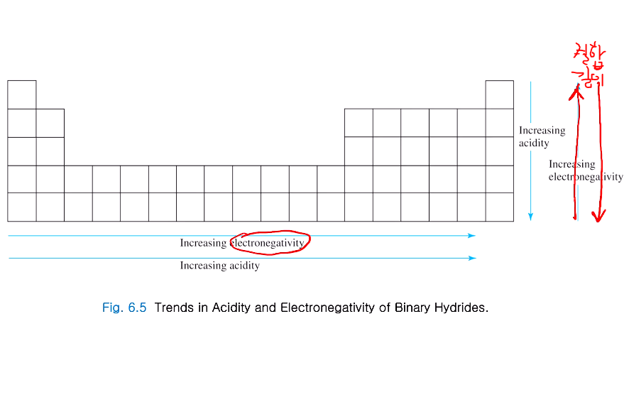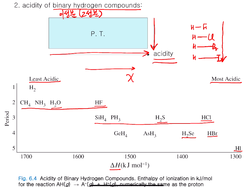 이 수소화합물에서 수소를 얼마나 잘 내놓는가가 산도에 영향을 미친다. 다른 원소가 주기율표상 수소를 제외한 두 가지 성분으로 이루어져 있으니 다른 한 원소는 주기율표상에서 어디에 있는가?.. 오른쪽 아래로 갈수록 산도가 높아진다. 일반적인 주기적인 성향은 주로 오른쪽 위 내지는 왼쪽 아래였는데 이성분 산도는 일반적인 동향과 달리 오른쪽 아래로 가야 산도가 증가한다. 주기율표상 오른쪽으로 갈수록 델타H가 줄어든다. 그럴수록 산도가 증가하는 경향을 보인다. 같은 족에서도 F, Cl, Br, I로 갈수록 델타 H값이 작아진다. 즉 산도가 증가!