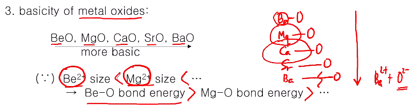 3. 금속산화물의 염기도와 관련이다. 한 예로서 알칼리토금속(alkali earth metal) 베릴룸, 마그네슘, 칼슘, 스트론튬, 바륨의 염기도를 조사해보면, lux flood 산염기로써 어느 게 산소이온을 더 잘 내놓느냐가 더 좋은 염기이다. 이 경우도 이성분 수소 화합물과 유사하게 베릴륨과 산소와 결합길이... Mg, Ca, Sr, Ba(점점 원자가 커진다.)순으로 O와 결합길가 증가하고, 결합길이가 증가하면 결합 에너지가 낮아지는?약해서 끊어지기 쉽고, Ba2+ + O2-로 해리하기 쉬우니 염기도가 늘어난다. 금속 산화물은 100% 이온결합이라 할 수 없지만... 이온결합성이 강하다면, 이온결합은 같은 차지라 했을 때 거리가 가까울수록 더 결합력이 강한 거!!! 결합에너지가 가까운 결합에 있어서 강하다.