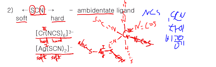 ambidentate ligand(양쪽 결합자리 리간드)를 볼 것이고 그 예로 Thiocyanate가 있다. SCN-에서 S 쪽으로 결합하면 소프트, N쪽으로 결합하면 하드한 리간드가 된다. 어떤 금속이온에 따라서 달라진다.