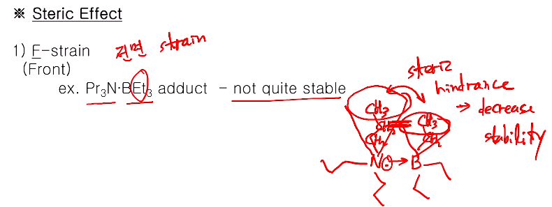 1) F-strain: F는 front로 전면 스트레인이다. 프로필아민(Pr3N)과 트라이 에틸보론(BEt3)이 서로 결합해서 아민은 루이스 베이스, 보론화합물들은 루이스 산으로 산염기 어덕트를 형성한다. 그러나 어덕트 만들어지는 과정에서 안정하지 못하게 된다. 왜냐면 F 스트레인이 발생하기 때문이다. 프로필 아민 경우 프로필기가 아민에 세 개 붙은 위 그림과 같다. N에 비공유 전자쌍이 B(보론)에 비어있는 오비탈에 제공되는 형태다. N에 결합된 프로필이 가만히 있는게 아니라 콘 영역에서 돌면서 공간을 차지하고, 비슷하게 보론의 에틸기 3개가 콘 영역으로 공간을 차지하는데 이 겹쳐지는 부분에서 입체장애(F-strain, streic hindrance)이 일어난다. 이것 때문에 N이 전자 두 쌍이 보론에 주려고 다가가면 위 콘 영역에 콘이 서로 부딪혀 장애가 생겨 가까이 못 가고 어덕트를 생성 못하고 안정하지 못하게 된다.