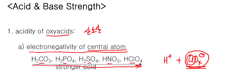 지난 차시는 산 염기 정의 및 구분, 어떤 산 염기가 있는지 등 공부했다. 오늘은 산 염기의 세기에 관련된 것과 하드 소프트 개념 배울 것이다. 먼저 산 염기 세기에 있어서 소개될 것이 oxyacids(산소산: 산소원자가 포함되어 있는 )이다. 산소산의 산도는 화학식 보고 판단할 수 있는 기준이 있다.
