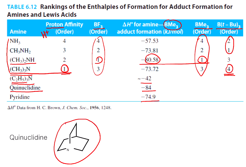 위 표를 보면 프로톤 affinity(친밀도)가 트라이 메틸 아민이 1등이었는데 터셔리 뷰틸 보론에서는 꼴찌다. 중간 쯤이 되는 BF3, BMe3에서는 순서가 뒤바꼈다. 유도효과와 얼마나 전자 잘 주개인가에 따라서, 입체효과에 상충돼서 입체효과가 영향 없을 때는 유도효과로 입체효과가 크게 되면 꼴찌가 된다. Q 즉, 상대적인 영향력은 입체효과가 유도효과 보다 크군?