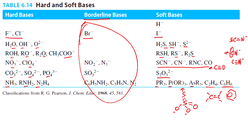 일반적으로 확장해서 표로 보면 위와 같다. 베이스에 있어서 하드 소프트 정확한 기준으로 나누는 게 아니라서....중간쯤에 걸쳐서 어떤 상황에는 소프트, 하드 둘 다 되는 것들도 있다. 전체적으로 보면 하드는 같은 할로겐이라고 해도 전기음성도가 큰 위쪽에 있는 F,Cl은 하드로 Br은 보더라인 I는 소프트! 나머지들은 중심원자가 2주기원소이며 -가 O,N에 있음! 2주기 원소에 비공유 전자쌍이 있는 경우 하드인 반면 SCN-, CN-의 경우 3중결합하고 C쪽으로 결합하고...?SCN도 SC쪽으로 결합하고...? 이중, 삼중 결합형태는 소프트 하다. 싸이오 설페이트 S2O32-는 설퍼(S)로 결합하는형태로 그 외 나머지도 이중 결합, 1.5결합 등 단일결합이 아닌 것들이 소프트 베이스? 꼭 보더라인이 어떻다고 상세히 알 필요는 없고... 경향성만 알면 된다.